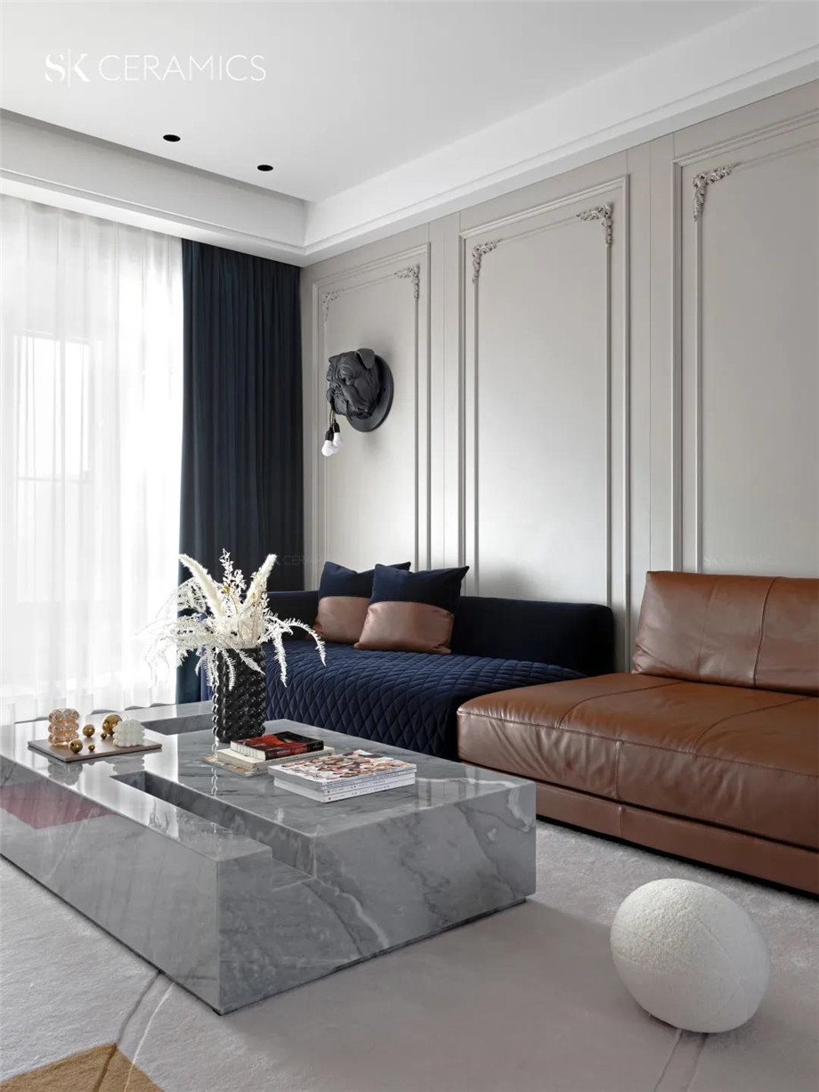 以SK 800x1800mm的木玉灰作為整體空間的主磚,原創獨特的自然肌理,質感簡約而不乏個性,搭配溫柔香草奶油色護墻,絨布與皮革的拼色沙發,冷與暖,現代時尚融合溫柔唯美,互相印襯,勾勒出別具一格的空間格調,也恰似案例主人公胡姨剛柔并濟的特性。
