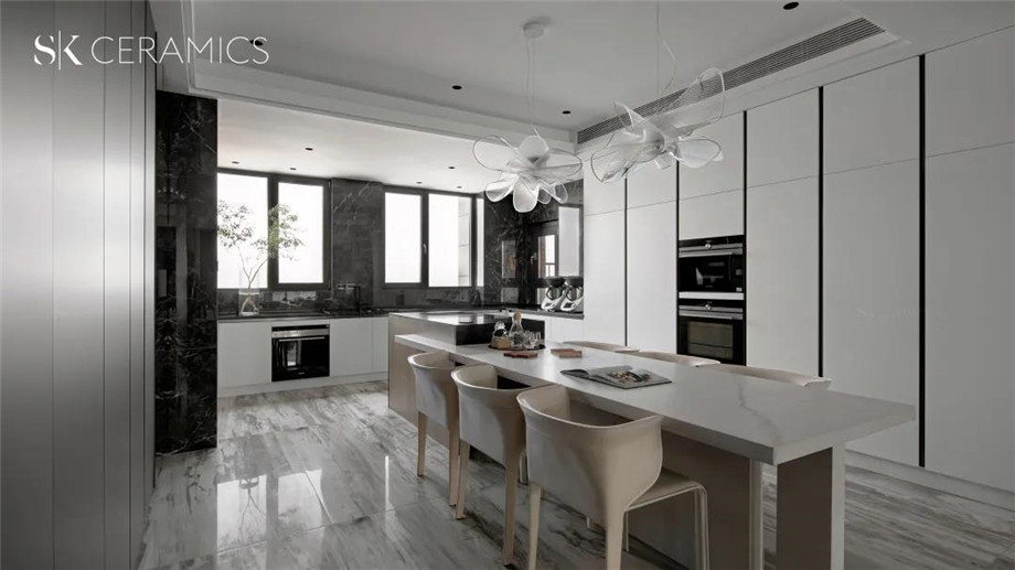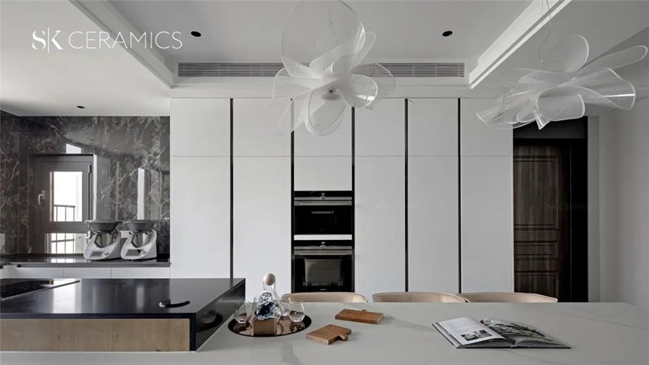 SK 800x1800意大利黑,色彩斑駁 深淺交錯,富有層次感的大理石紋理,給空間一種充滿想象力的神秘感,搭配白色調的櫥柜設計,一張一弛,賦予空間靈動的氣息。