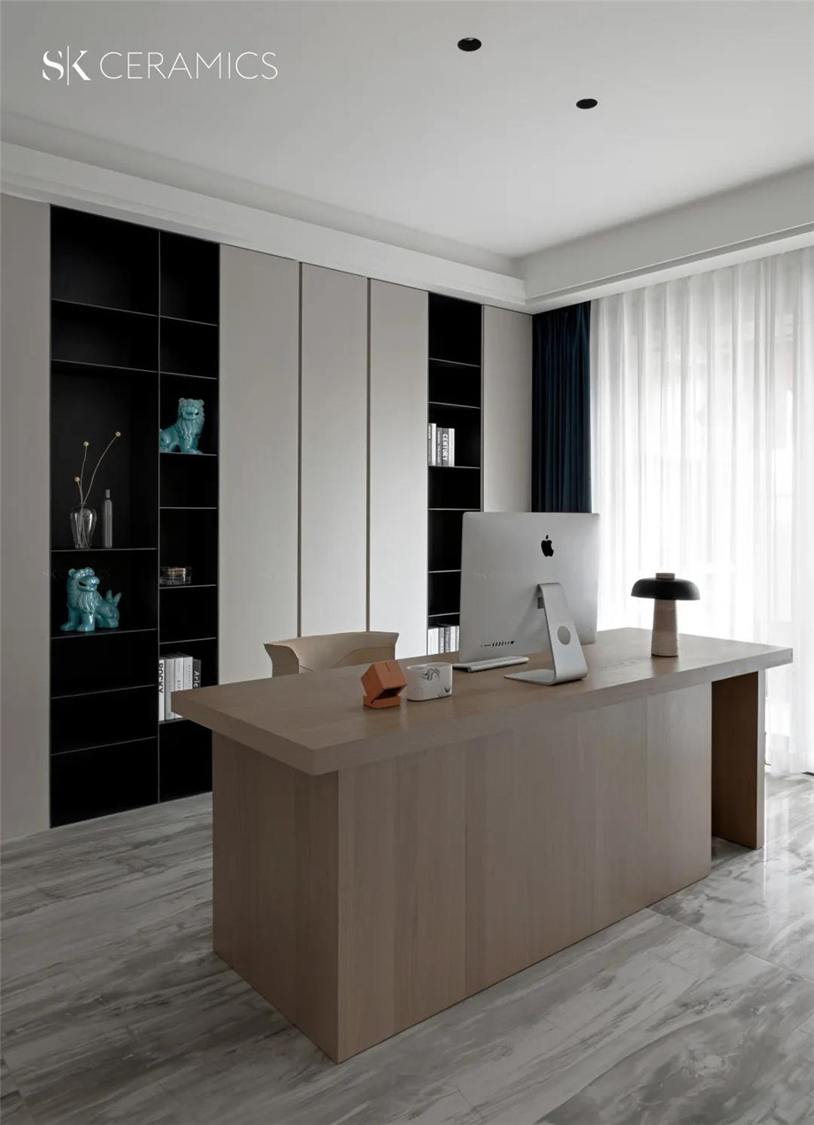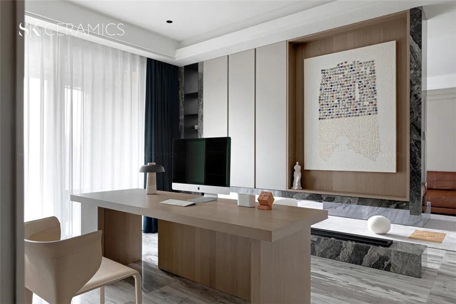 半敞開式的書房空間,是設計師巧思設計,使書房空間與客廳相互貫通,讓是一家人皆可以使用的空間,靜謐舒適又相對獨立。地面鋪設SK 800x1800mm的木玉灰,柔和低調中自帶沉靜、質樸,與書房格調完美融合。