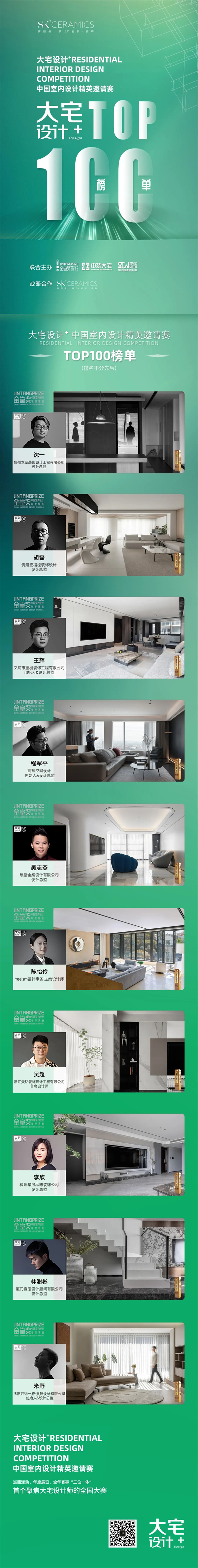 萬眾矚目,專業認可,2022年度“中國大宅設計·Top100”獲獎名單!熱烈祝賀SK瓷磚合作設計師榮獲大獎(排名不分先后),表彰與鼓勵這批中國大宅設計師的杰出代表!