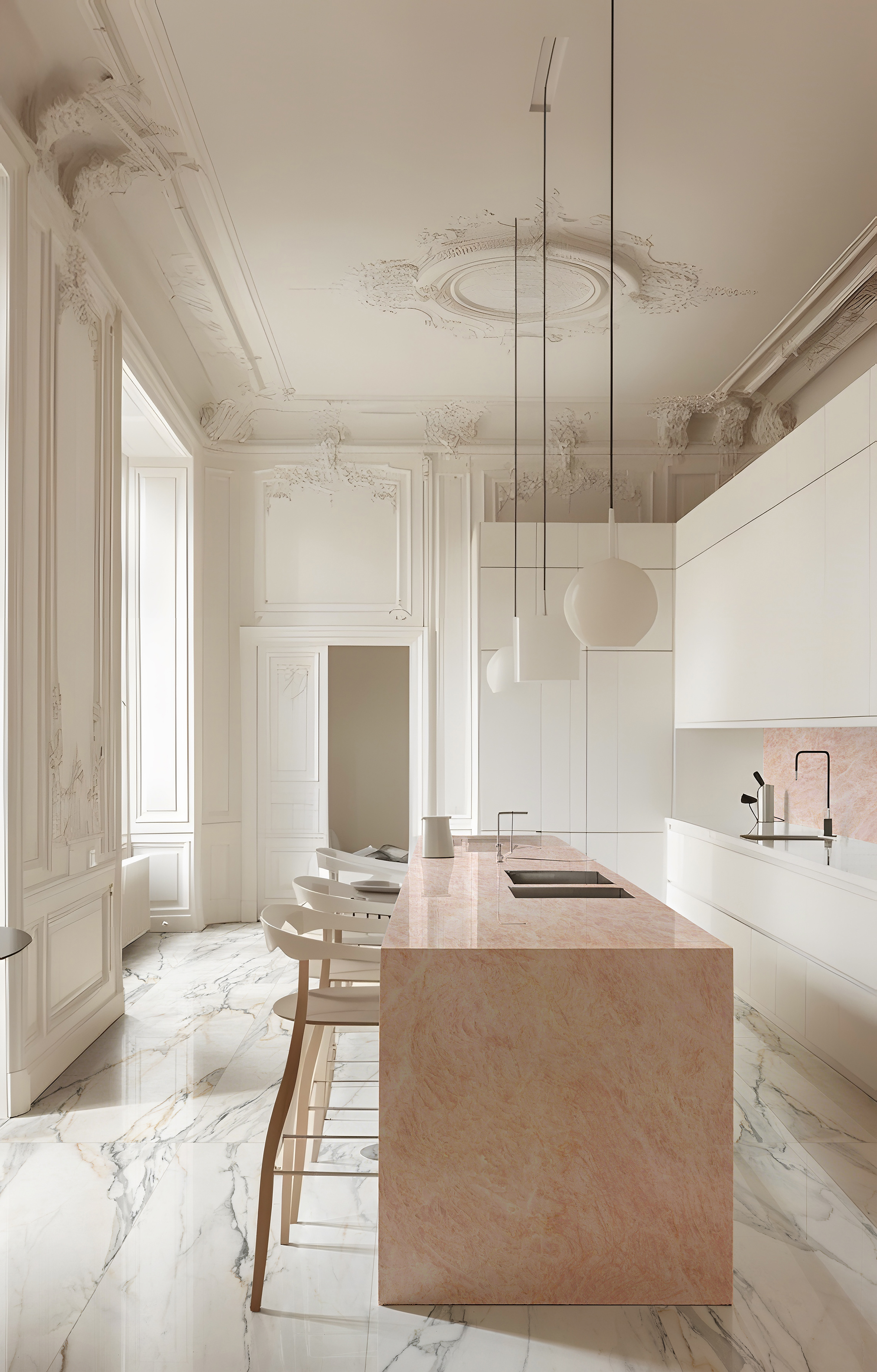 充滿秩序與韻律的長廊,伴隨著和諧的色彩,大花白的動靜交織與金屬色的巧妙裝飾,令空間雅致而富有生機。